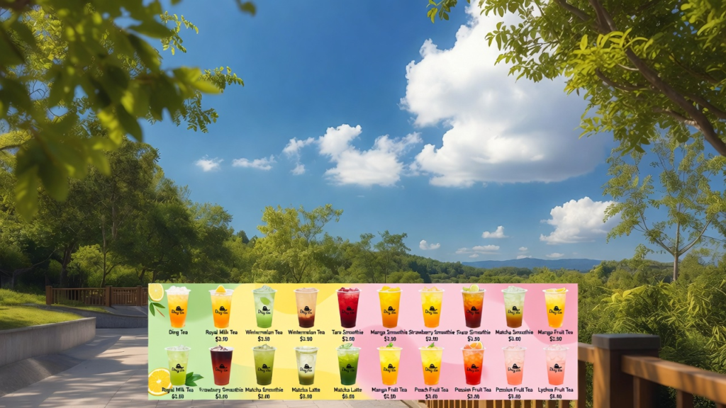 There are many yummy drinks on the ding tea menu that you should try. One favorite is brown sugar milk tea — it’s creamy and sweet with chewy boba at the bottom. If you like fruity drinks, try the passion fruit green tea or mango slush. They’re fresh, tasty, and very colorful. Some people love matcha latte for its rich, green tea flavor. Taro milk tea is also a top pick because it’s sweet, creamy, and purple! You can try different toppings like aloe vera or rainbow jelly to make it even more fun. These drinks are not only tasty but also very pretty to look at!